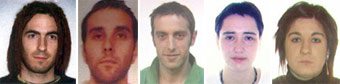La Guardia Civil ha difundido las fotografías de cinco terroristas de ETA. Se trata de Aitzol Iriondo, Jurden Martitegi, Agurne Salterain, Oroitz Aldekoa y Eider Uruburu Zabaleta. Al parecer, el primero de ellos es el terrorista que logró huir tras el asesinato de los dos guardias civiles en Capbreton (Francia) y el resto son activistas que en estos momentos podrían estar en España preparando alguna acción para llevar a cabo su particular campaña electoral. El historial de todos ellos es casi calcado: se iniciaron en la kale borroka y de ahí pasaron directamente a empuñar las pistolas y las bombas. Un pobre curriculum para estos gudaris del siglo XXI.