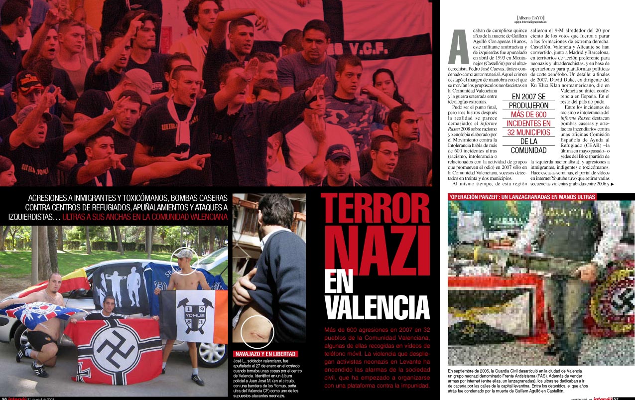 Mi compañero Alberto Gayo es el mejor especialista de España en tramas ultraderechistas y nazis. A lo largo de los últimos diez años ha publicado magníficos reportajes sobre el tema: los ultrasur, los partidos de ultraderecha que se escondían bajo denominaciones limpias… Por eso, os recomiendo que leáis con atención el reportaje que publica esta semana en Interviú acerca de los grupos nazis que campan a sus anchas por la Comunidad Valenciana. Hacía tiempo que Alberto no se prodigaba en estos temas, pero la espera ha merecido la pena: fotos inéditas y vídeos exclusivos en los que se ve a estos cachorros fascistas realizando actos tan heroicos como cortar el pelo a un yonqui o hacerle comer excrementos. No os lo perdáis. Está en la página 56…