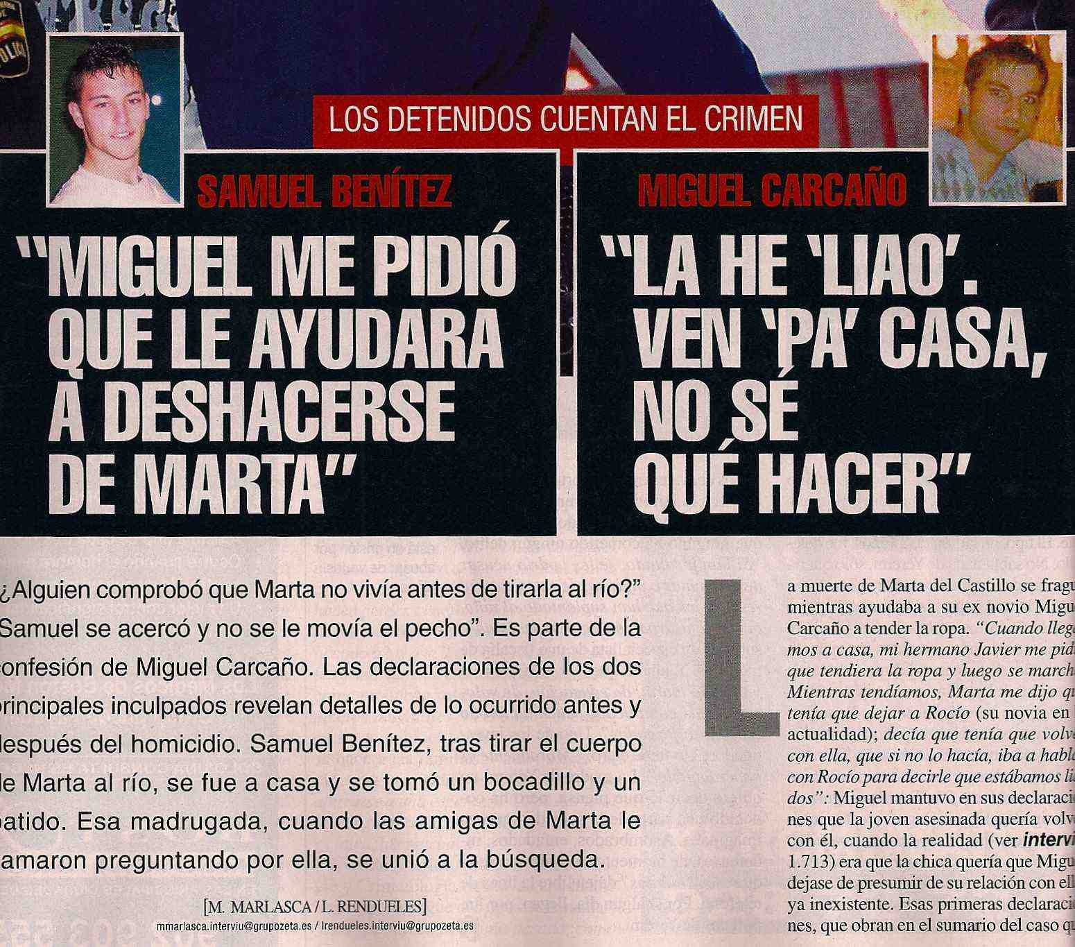 He escrito aquí mucho sobre el tema de Marta del Castillo, especialmente sobre el tratamiento que le han dado los medios al crimen. En Interviú hemos sido prudentes. Afortunadamente, todavía podemos seguir haciendo periodismo de sucesos. Eso es lo que intentamos semana a semana mi compañero Luis Rendueles y yo. Por eso, esta semana nos limitamos a publicar el contenido de las declaraciones de Miguel Carcaño y Samuel Benítez, los dos principales inculpados por el crimen, en dependencias policiales. Sus testimonios completos, tal y como lo dijeron en comisaría. Nada más. Lo podéis leer esta semana en Interviú.