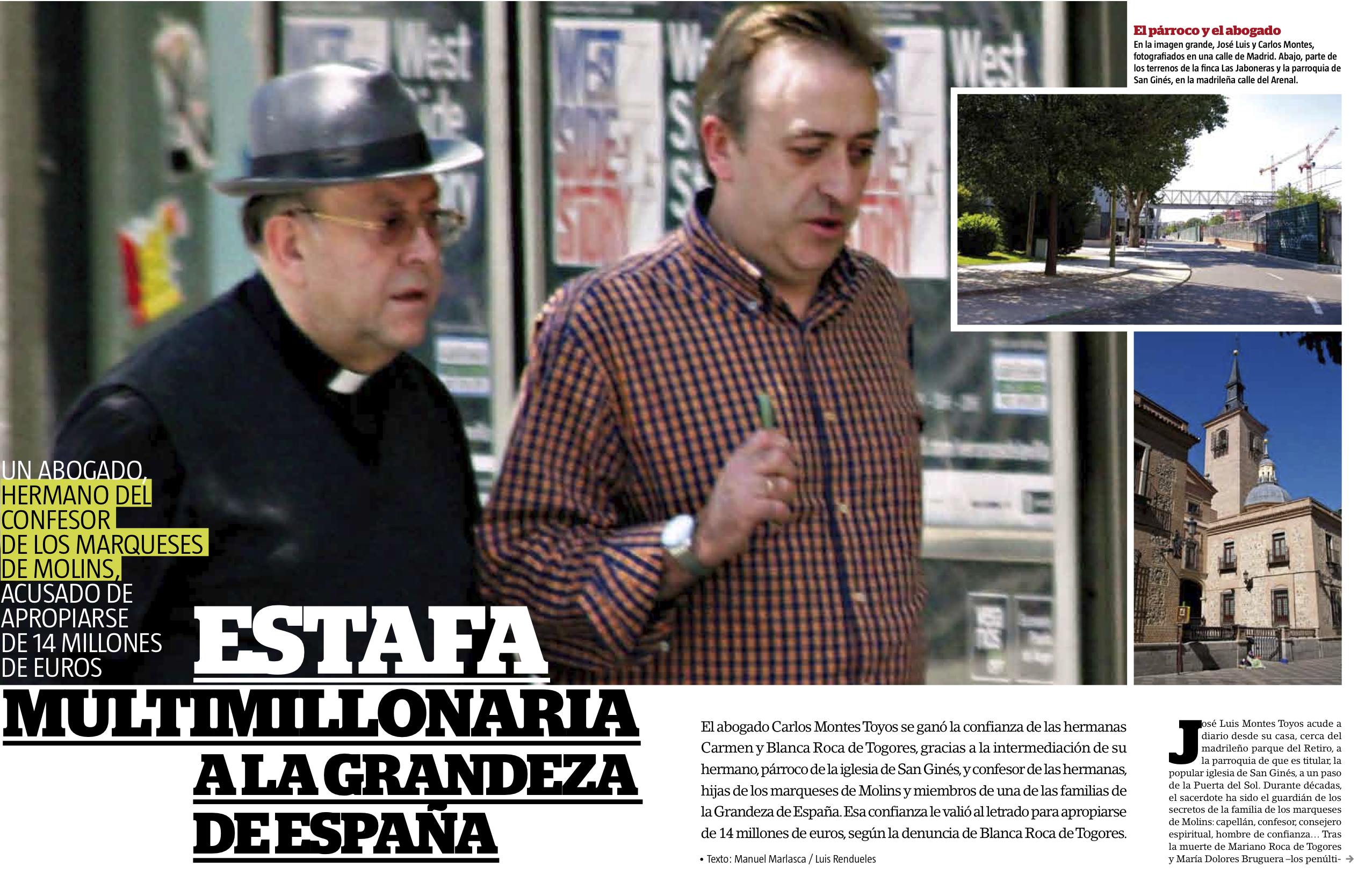 Un abogado, Carlos Montes Toyos, hermano del párroco de San Ginés y confesor de la familia, José Luis Montes Toyos, fue detenido y acusado de los delitos de estafa y apropiación indebida. El Juzgado de Instrucción número 2 instruye las diligencias, tras una denuncia de Blanca Roca de Togores y su sobrino. Según esta denuncia, a la que ha tenido acceso Interviú, el abogado se ganó la confianza de las hermanas gracias a la mediación del párroco, consejero espiritual de las mujeres. Una vez que el letrado tuvo en su poder varios poderes otorgados por las hermanas, herederas de una multimillonaria herencia, vendió a un testaferro una de las empresas familiares, propietaria de un terreno ocupado por el Ayuntamiento de Madrid desde 1984. El abogado, siempre según la denuncia, ocultó a las hermanas Roca de Togores el valor de la finca expropiada y, una vez que la empresa sociedad ya no estaba en manos de las hermanas del marqués de Molins, cobró 14 millones de euros, un dinero que la policía y el juzgado buscan en Luxemburgo, hasta donde presuntamente Carlos Montes lo transfirió.
