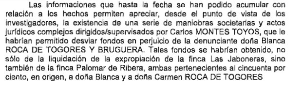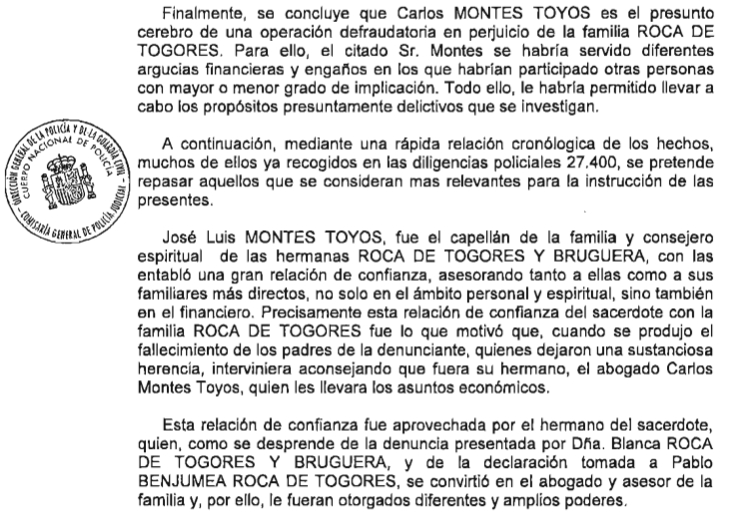 Aquí me limito a decir que me sorprende que la carta de rectificación no sea firmada ni remitida por el abogado Carlos Montes Toyos, que fue detenido y está imputado por estafa, apropiación indebida y delito contra la hacienda pública; ni siquiera la remite su hermano, el sacerdote José Luis Montes Toyos, al que también hacía referencia la información y del que se decía –reproduciendo textualmente las diligencias policiales– que fue la persona que puso en contacto a las hermanas Roca de Togores con el abogado ahora imputado. La misiva está firmada por Carmen Roca de Togores, residente en Finlandia, que se trasladó hasta el Consulado español en Bélgica para firmar un poder notarial.