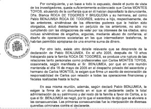 La carta no rectifica hechos, sino que da opiniones sobre el reportaje y habla de los presuntos perjuicios causados a los hermanos Montes Toyos –aunque no son ellos los que se defienden–. Lo único que, de momento, tengo que decir, es que la información se elaboró con el máximo rigor, contrastando todo tipo de fuentes y que cada una de las afirmaciones que se hacen están extraídas de las diligencias 1301/2010 que se instruyen en el Juzgado de Instrucción número 2 de Madrid y de las diligencias 41.477 de la Unidad de Delincuencia Económica y Fiscal de la Comisaría General de Policía Judicial. Os reproduzco aquí parte de esas diligencias, para que comprobéis la veracidad de lo que contamos.