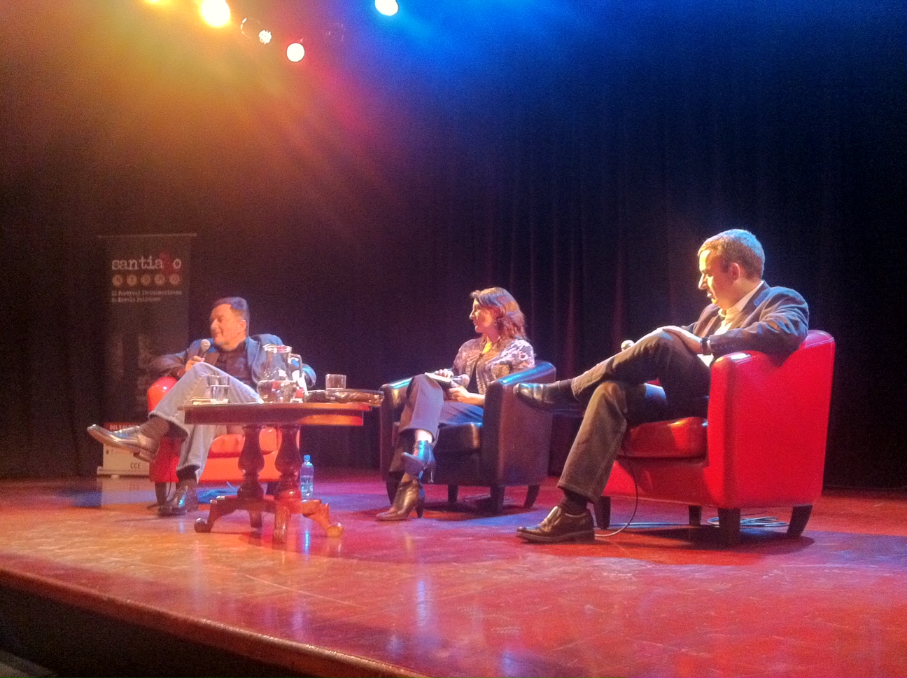Lorenzo Silva y el escritor chileno Roberto Ampuero han sido los protagonistas del plato fuerte de hoy en Santiago Negro. A hora y media del inicio de todo un Chile-Argentina clasificatorio para el Mundial, el Centro Cultural de España se ha llenado para escuchar a los creadores del guardia civil Bevilacqua y el detective Cayetano Brulé. Y sobre esos personajes, su génesis y su crecimiento, ha tratado gran parte del acto. Lorenzo Silva ha contado que sus personajes nacieron en 1994, después de que él pensase en una historia: el crimen de una turista en una pequeña cala de Mallorca –el arranque de El Alquimista impaciente–. Esa primera novela protagonizada por Bevilacqua y Chamorro fue, según su autor, «un entremetimiento de verano» y el nacimiento de una pareja que «me ha permitido contar lo que ocurre en la sociedad española». Claro que no todo iban a ser parabienes hacia su creación y Silva se ha quejado, con cierta sorna, de que la entrada de Bevilacqua en Wikipedia es mucho más extensa que la de él mismo.