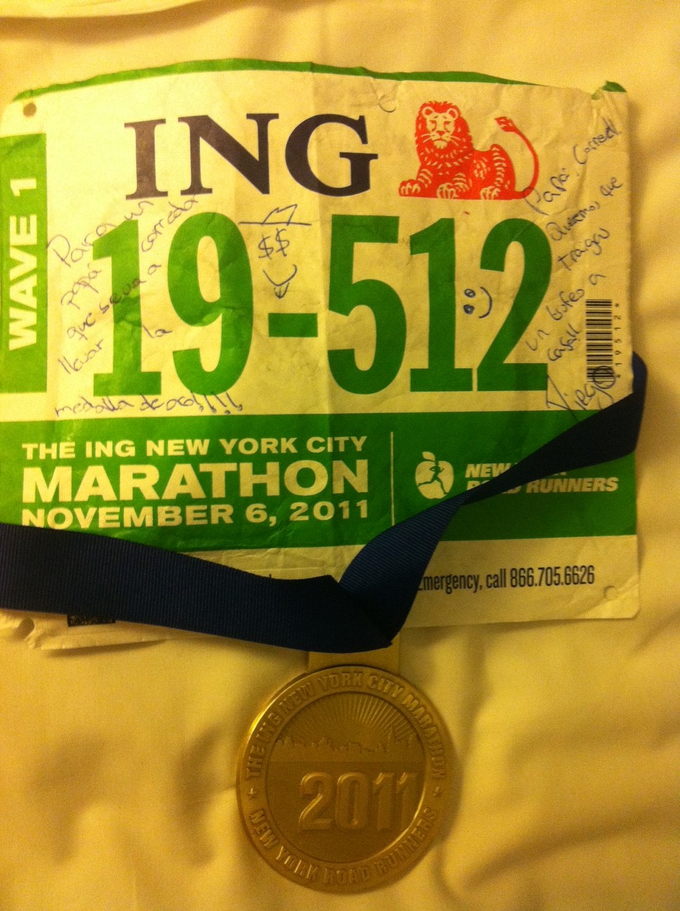 Más de cinco kilómetros por la Primera Avenida de Manhattan y casi dos por el Bronx dan paso a la parte final del maratón, a esas cinco millas que discurren por la 5ª Avenida y Central Park. «Go, Manuel, go, you got it», «Vamos Manuel, está hecho». Tengo una nebulosa sobre esas últimas millas, en las que oí esas palabras en inglés y en castellano miles de veces, con todos los acentos posibles a miles de personas que se agolpaban en la parte final de la carrera. Creo que paré alguna vez, que acabé entrando a la meta con un compatriota al que me abracé al terminar, que cuando enfilé la milla 26, en la entrada de Central Park por Columbus Circle, sonaba Bon Jovi y canté a gritos Living on a prayer… Mi siguiente recuerdo es el de la voluntaria que me puso la medalla, tras cruzar la meta, diciéndome: «Congratulations» y arropándome con una manta térmica, mientras yo rompía a llorar porque sentía que había vuelto a nacer.