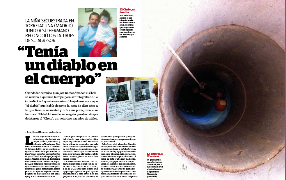 El pasado verano, una niña de diez años y su hermano, de ocho se convirtieron en los protagonistas de uno de los sucesos más terribles del año: un hombre secuestró a los dos pequeños en Torrelaguna (Madrid), agredió sexualmente a la cría y arrojó a los dos hermanos a un pozo, donde habrían muerto de hambre y de sed si no hubiese sido porque el azar hizo que dos jóvenes pasasen por allí. Esta semana contamos en Interviú quién es Juan José Ramos Amador, alias El Chele, y adelantamos que el análisis de su ADN ha permitido imputarle un nuevo delito: el secuestro y la agresión sexual a una niña de ocho años, cometido en Madrid en 1999. Amador pasó diecisiete años en prisión por un delito sexual y salió de la cárcel en 1997. Es padre de tres hijos y se dedicaba a recoger chatarra y a delinquir, algo que lleva haciendo desde los dieciocho años.