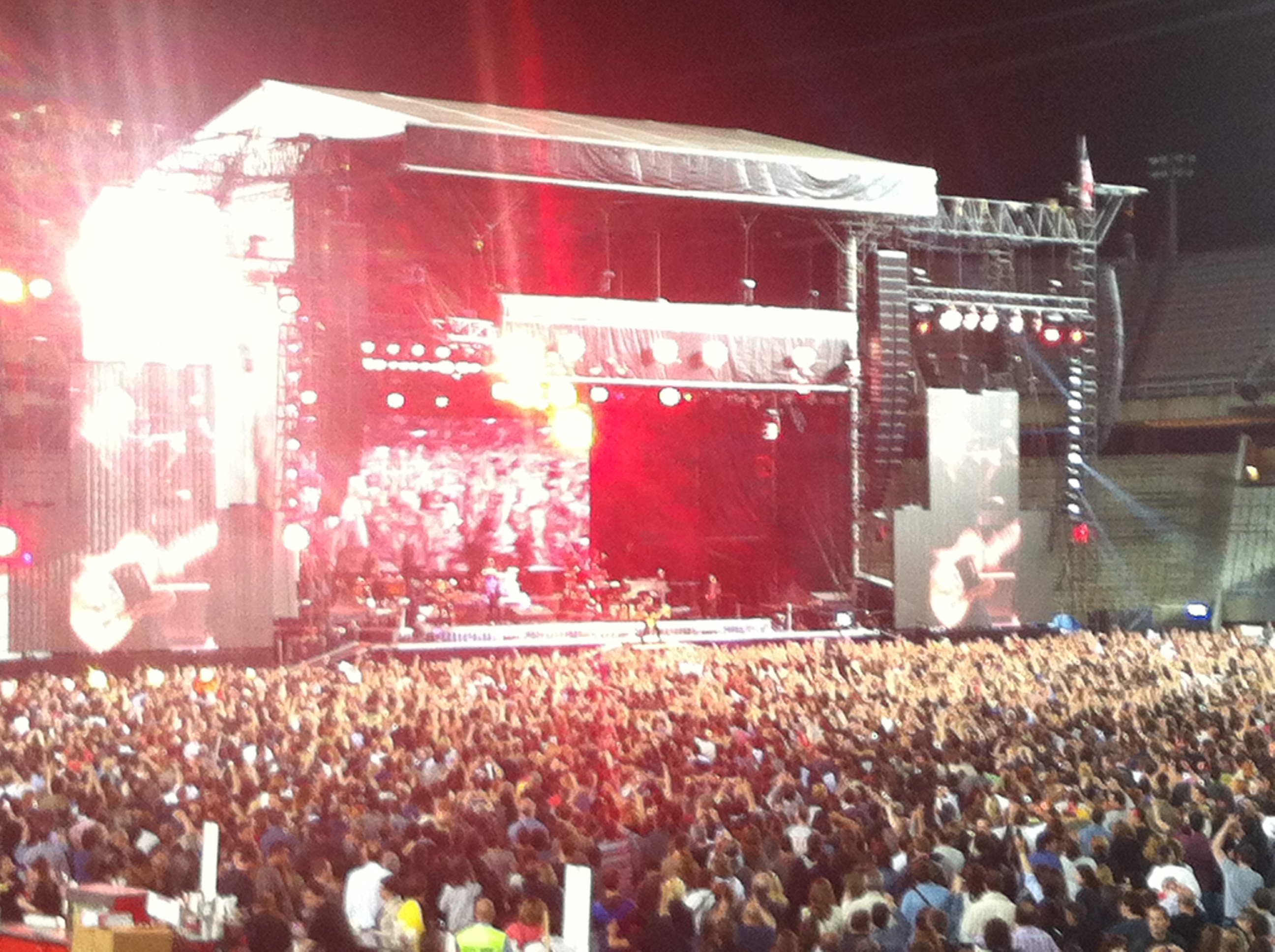 Uno no acaba de acostumbrarse a las eucaristías del rock en las que se convierten los conciertos de Bruce Springsteen. Llegas al estadio mirando con displicencia a los veinteañeros con pinta de acudir a su primer recital del Boss y te sientas en tu asiento reservado –ya pasó la época de estar en el césped– convencido de que verás algo que ha ya has visto. Desde mediados de los 80 escucho sus discos y acudo a sus conciertos. Un compañero de colegio me dejó el doble elepé de The River y en 1988 acudí vi por primera vez a Springsteen en directo. Era la época en la que se pasaba cuatro horas en el escenario, se escurría una esponja en sus partes y acababa el show con una inolvidable mezcla del Twist and shout y La Bamba. Desde entonces, le he visto con su banda, sin su banda, en Madrid y Barcelona, fundamentalmente. Así que ayer llegué al estadio Olímpico de Barcelona un punto resabiado, a la espera de escuchar un puñado de las canciones de Wrecking ball, que seguro mejoraría en directo, y con un un punto de tristeza por no ver al viejo Clarence Clemmons. No esperaba grandes novedades del resto del repertorio, pero anoche Bruce y los suyos me volvieron a dejar boquiabierto.