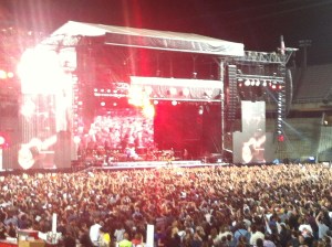El caso de Springsteen debe ser único en la historia del rock. Ha hecho discos malos, como Tunnel of love, Lucky town, Human touch; discos regulares, como Working on a dream o este Wrecking ball; discos buenos, como The ghost of Tom Joad o The rising. Y ha hecho un puñado de obras maestras –The river, Darkness on the edge, Born in the USA, Born to run– que siguen siendo la base de sus recitales, o al menos la base que sirve para que sus seguidores enloquezcan y caigan rendidos, una vez más ante el Boss. Anoche eso pasó con un final de concierto –otra vez todas las luces del estadio encendidas– formado por un sobrio The River –también desnudo, sin sitares ni otros fuegos de artificio–, unas bellísimas Bobby Jean y Thunder Road –confieso mi absoluta debilidad por esas dos canciones– y Born to run, Born in the USA y Tenth Avennue, que sirvió de homenaje a Big Man. Así que la canción más moderna de ese apoteósico final data de… ¡1984!